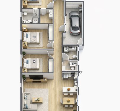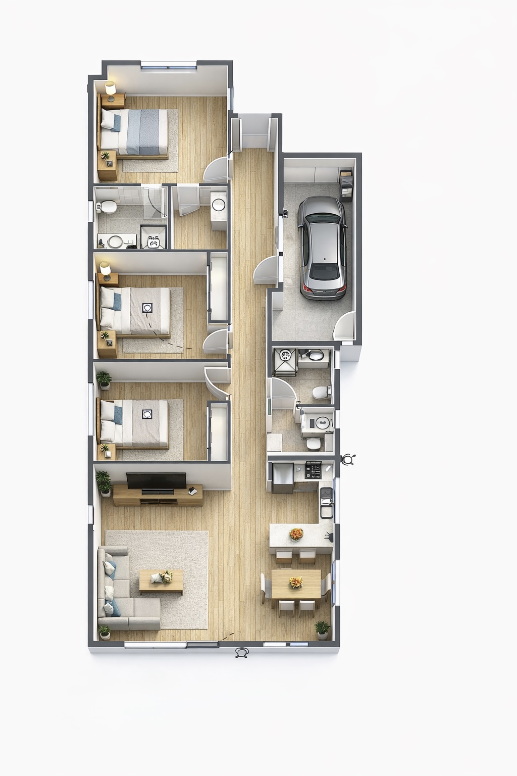 Three bedrooms with ceiling fans