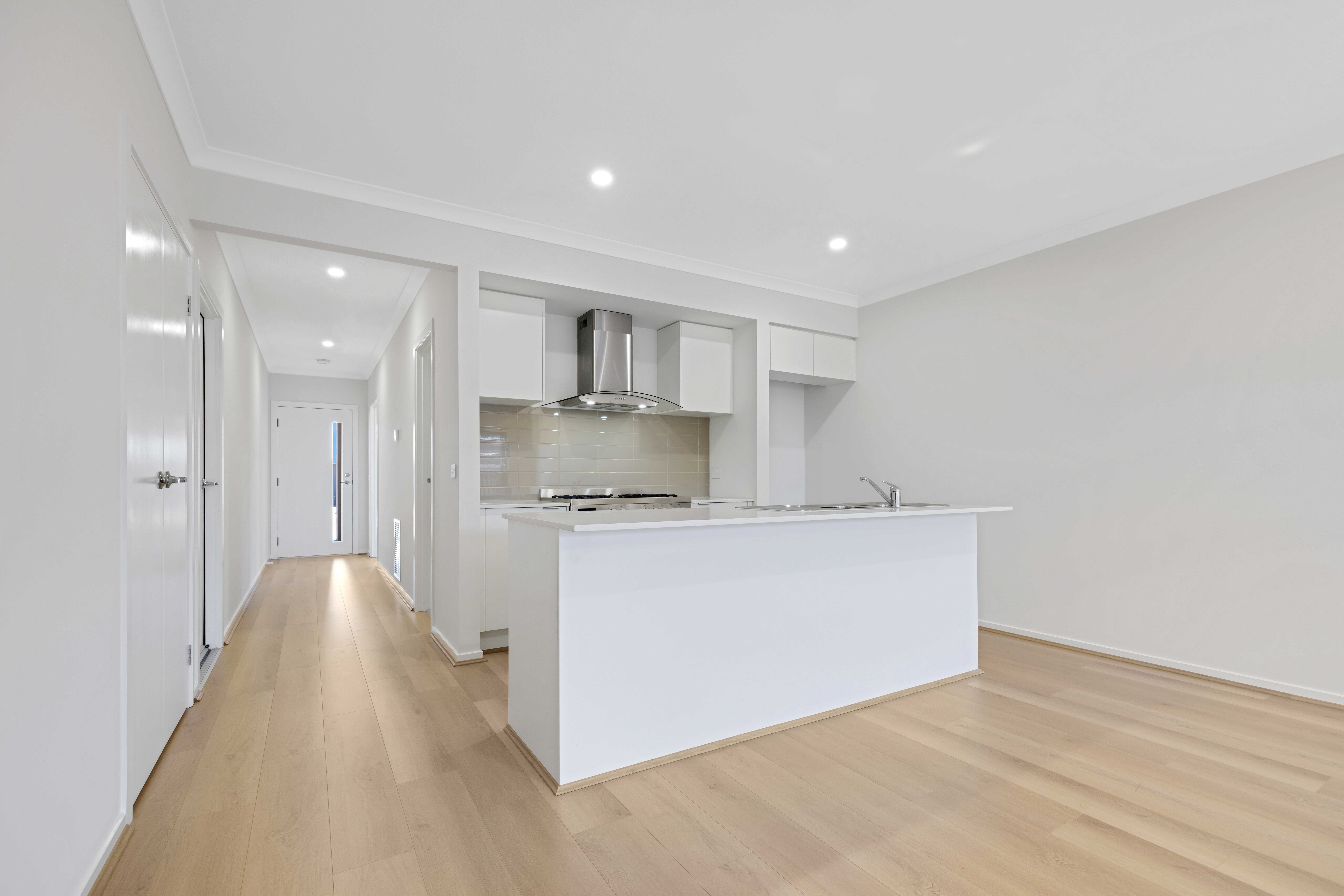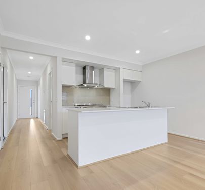 The open-plan kitchen and living area creates a practical and inviting space for everyday living, with a layout designed for efficiency and ease. The kitchen forms the centre of the home and is equipped with gas cooking and an under-bench dishwasher for added functionality.