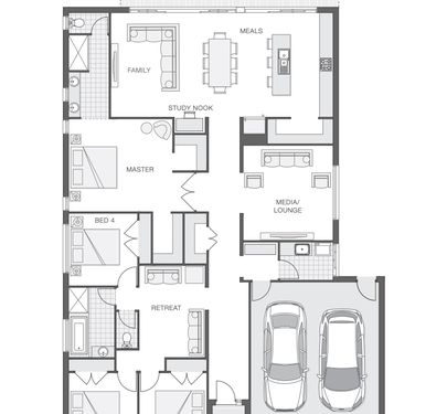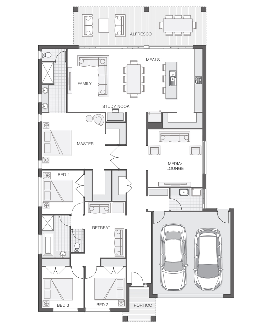 Multiple living zones (family, media/lounge, and open-plan living)